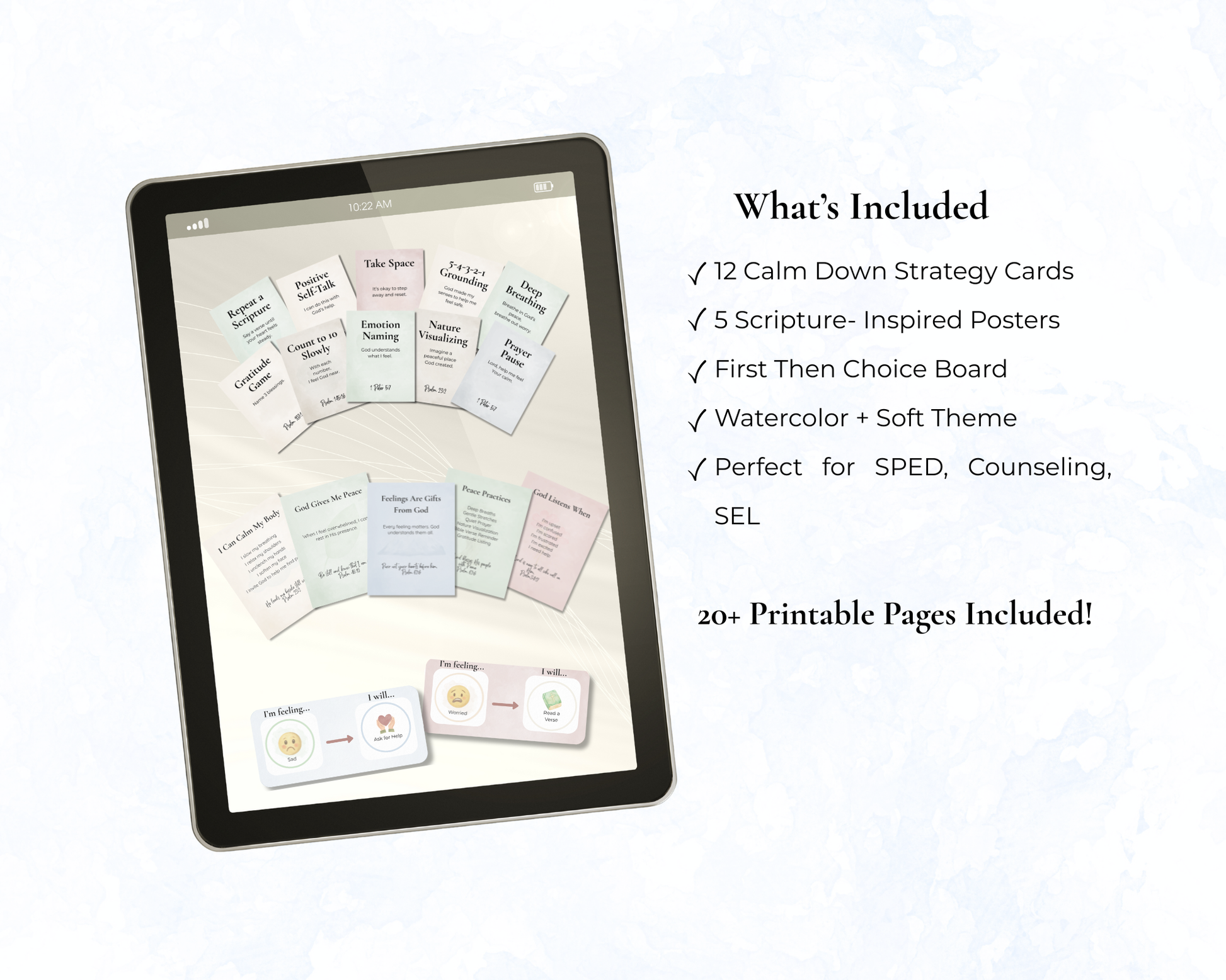 Help your students find peace, regulate emotions, and reconnect with God through this beautifully designed calm down corner toolkit. Created with soft watercolor artwork and scripture-based encouragement, this bundle is perfect for classrooms, homeschool, counseling, calm-down spaces, or children's ministries.